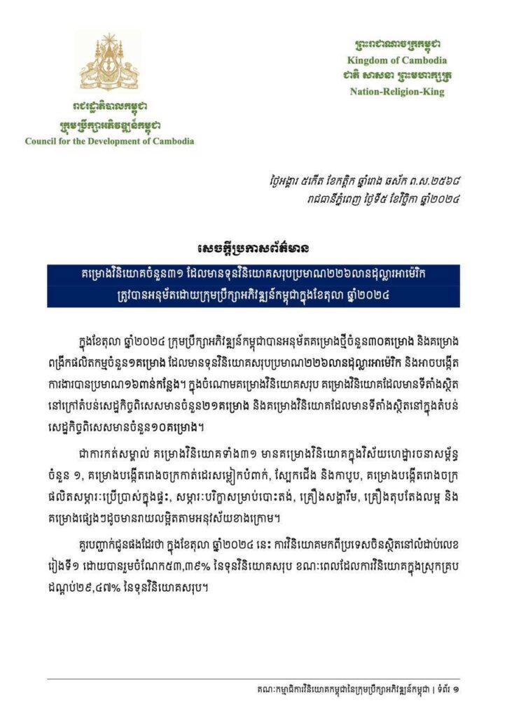 គម្រោងវិនិយោគចំនួន ៣០គម្រោង និងគម្រោងពង្រីកផលិតកម្ម ចំនួន ០១គម្រោង (សរុប ៣១គម្រោង) ដែលមានទុនវិនិយោគសរុបប្រមាណ ២២៦លានដុល្លារអាមេរិក និងអាចបង្កើតការងារបានប្រមាណ ១៦ ០០០កន្លែងត្រូវបានអនុម័តដោយ ក្រុមប្រឹក្សាអភិវឌ្ឍន៍កម្ពុជាក្នុងខែតុលា ឆ្នាំ២០២៤