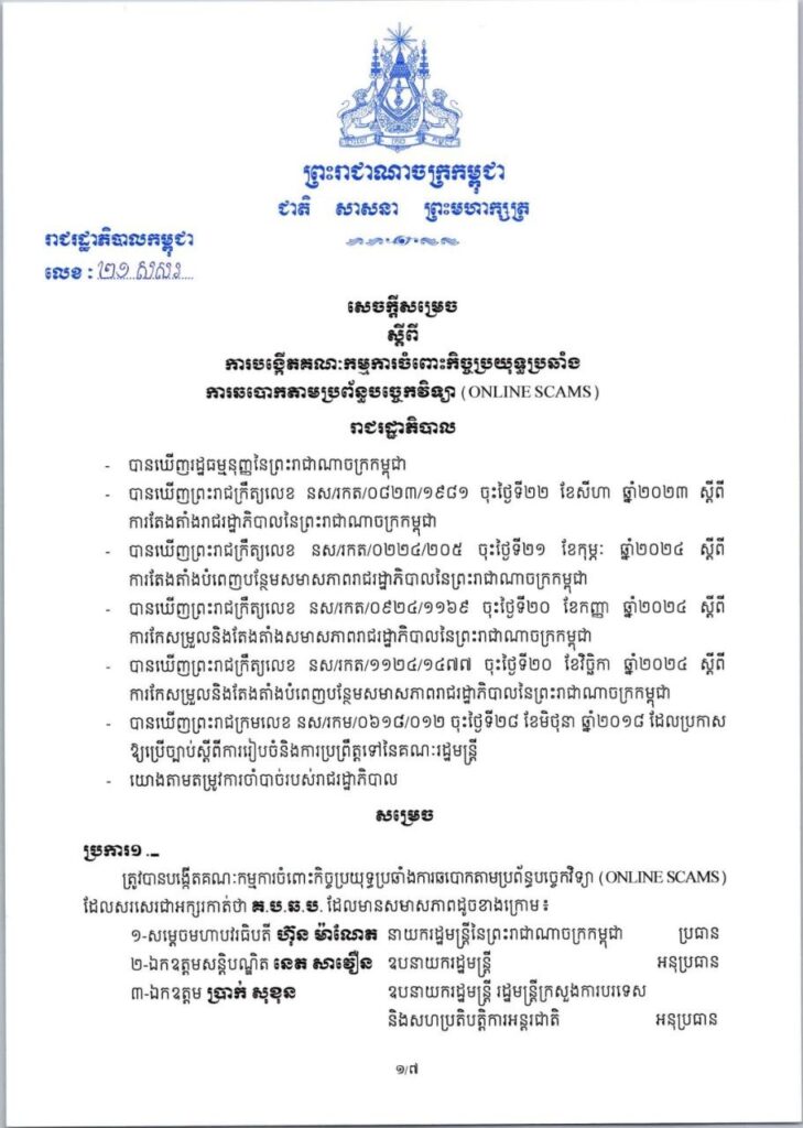 សេចក្តីសម្រេច ស្តីពី ការបង្កើតគណៈកម្មការចំពោះកិច្ចប្រយុទ្ធប្រឆាំង ការឆបោកតាមប្រព័ន្ធបច្ចេកវិទ្យា (ONLINE SCAMS)