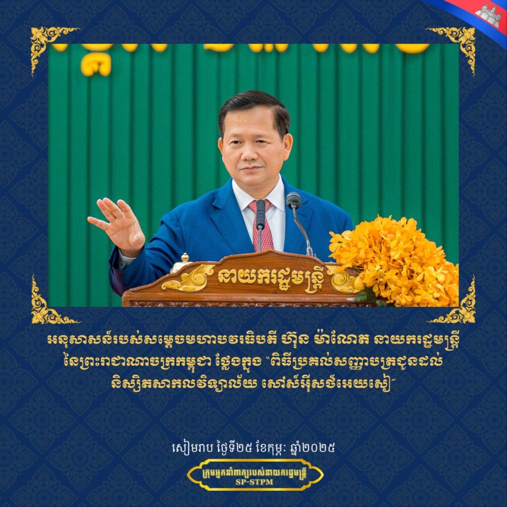 អនុសាសន៍របស់សម្តេចមហាបវរធិបតី ហ៊ុន ម៉ាណែត នាយករដ្ឋមន្រ្តី នៃព្រះរាជាណាចក្រកម្ពុជា ថ្លែងក្នុង “ពិធីប្រគល់សញ្ញាបត្រជូនដល់និស្សិតសាកលវិទ្យាល័យ សៅស៍អ៊ីសថ៍អេយសៀ” សៀមរាប ថ្ងៃទី២៥ ខែកុម្ភៈ ឆ្នាំ២០២៥