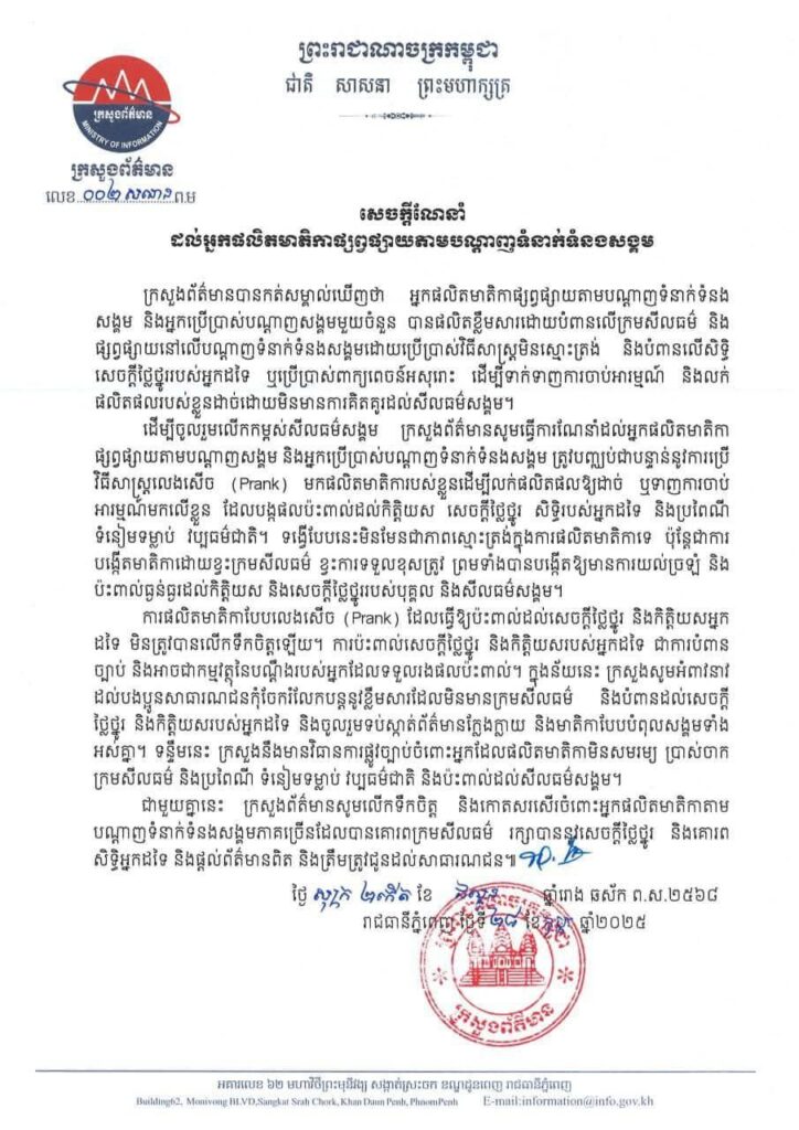 សូមបងប្អូនអ្នកផលិតមាតិកាផ្សព្វផ្សាយតាមបណ្តាញសង្គមនិងអ្នកប្រើប្រាស់បណ្តាញទំនាក់ទំនងសង្គម បញ្ឈប់ជាបន្ទាន់ការយកវិធីសាស្ត្រលេងសើច (Prank) មកផលិតមាតិការបស់ខ្លួនដើម្បីលក់ផលិតផលដាច់ ឬទាក់ទាញការចាប់អារម្មណ៍ដែលបង្កផលប៉ះពាល់ដល់កិត្តិយស សេចក្តីថ្លៃថ្នូរ និងសិទ្ធិរបស់អ្នកដទៃ។ នេះមិនមែនជាភាពស្មោះត្រង់ក្នុងការផលិតមាតិតាទេ ប៉ុន្តែជាការបង្កើតមាតិកាដោយខ្វះក្រមសីលធម៌ និងការទទួលខុសត្រូវ ព្រមទាំងបានបង្កើតឱ្យមានការយល់ច្រឡំ និងប៉ះពាល់ធ្ងន់ធ្ងរដល់កិត្តិយស និងសេចក្តីថ្លៃថ្នូររបស់បុគ្គល