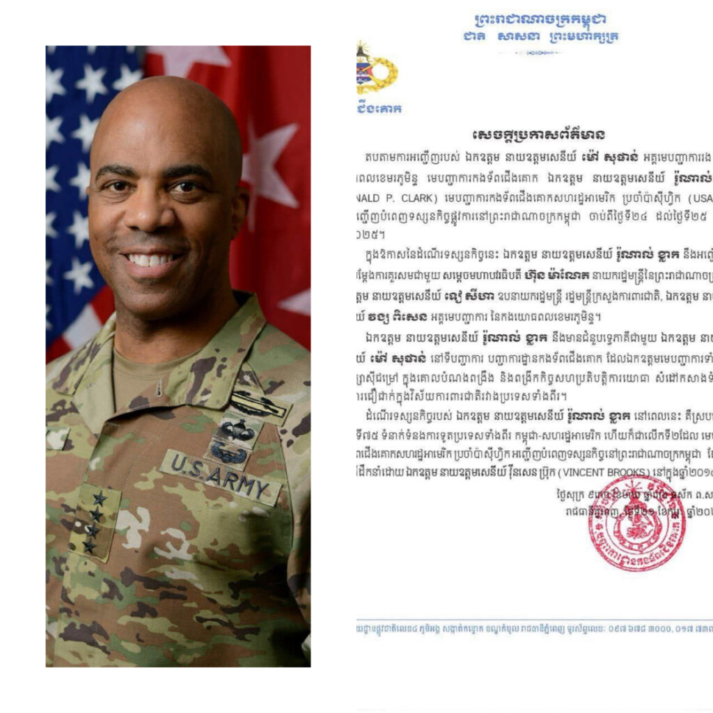 សេចក្ដីប្រកាសព័ត៍មាន៖ តបតាមការអញ្ជើញរបស់ ឯកឧត្តម នាយឧត្តមសេនីយ៍ ម៉ៅ សុផាន់ អគ្គមេបញ្ជាការរង នៃកងយោធពលខេមរភូមិន្ទ មេបញ្ជាការកងទ័ពជើងគោក ឯកឧត្តម នាយឧត្ដមសេនីយ៍ រ៉ូណាល់ ខ្លាក (RONALD P. CLARK) មេបញ្ជាការកងទ័ពជើងគោកសហរដ្ឋអាមេរិក ប្រចាំប៉ាស៊ីហ្វិក (USARPAC) នឹងអញ្ជើញបំពេញទស្សនកិច្ចផ្លូវការនៅព្រះរាជាណាចក្រកម្ពុជា ចាប់ពីថ្ងៃទី២៤ ដល់ថ្ងៃទី២៥ ខែកុម្ភៈ ឆ្នាំ២០២៥។
