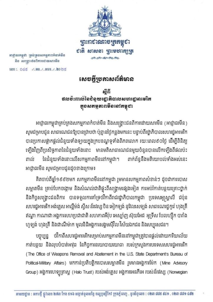 សេចក្តីប្រកាសព័ត៌មាន របស់អាជ្ញាធរកម្ពុជា គ្រប់គ្រងសកម្មភាពកំចាត់មីន និងសង្គ្រោះជនពិការដោយសារមីន ស្តីពី ផលប៉ះពាល់នៃជំនួយរដ្ឋាភិបាលសហរដ្ឋអាមេរិកក្នុងសកម្មភាពមីននៅកម្ពុជា