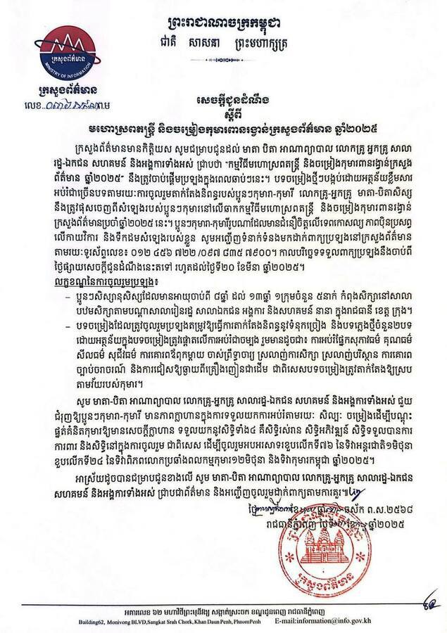 ក្រសួងព័ត៌មានមានកិត្តិយស សូមជម្រាបជូនដល់ មាតា បិតា អាណាព្យាបាល លោកគ្រូ អ្នកគ្រូ សាលា រដ្ឋ-ឯកជន សហគមន៍ និងអង្គការទាំងអស់ ជ្រាបថា “កម្មវិធីមហោស្រពតន្ត្រី និងចម្រៀងកុមារពានរង្វាន់ក្រសួង ព័ត៌មាន ឆ្នាំ២០២៥ នឹងត្រូវចាប់ផ្ដើមប្រឡងក្នុងពេលឆាប់ៗនេះ