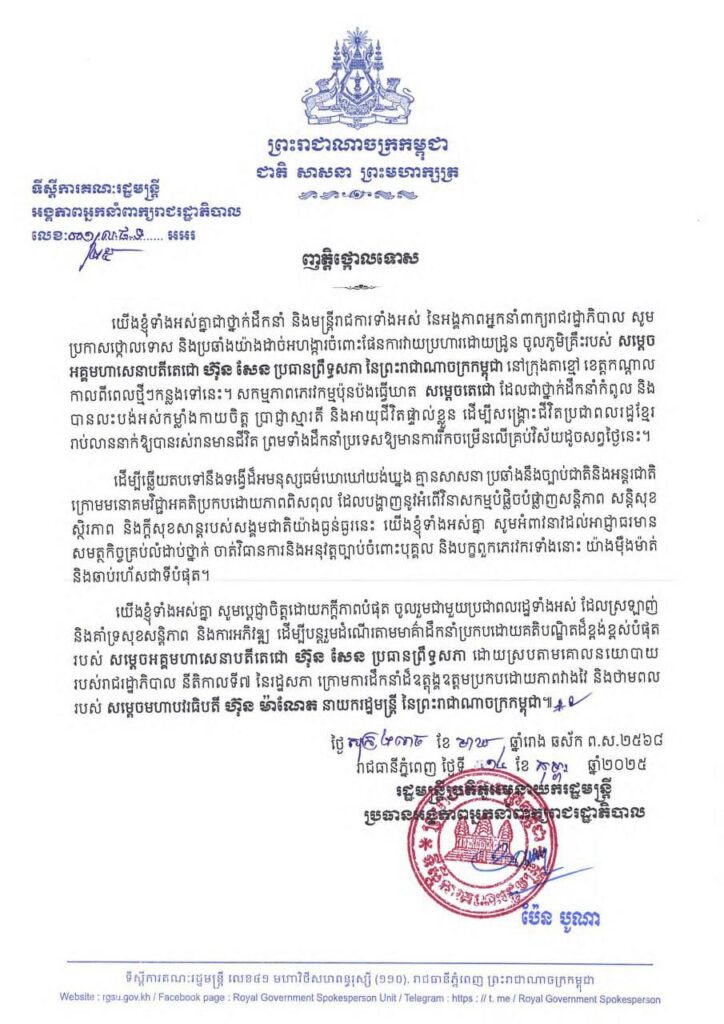 ឯកឧត្តម ប៉ែន បូណា ប្រធានអង្គភាពអ្នកនាំពាក្យរាជរដ្ឋាភិបាល ចេញញត្តិថ្កោលទោសយ៉ាងដាច់អហង្ការ ចំពោះគម្រោងវាយប្រហារដោយដ្រូន ចូលភូមិគ្រឹះរបស់សម្តេចតេជោ ហ៊ុន សែន ប្រធានព្រឹទ្ធសភាកម្ពុជា