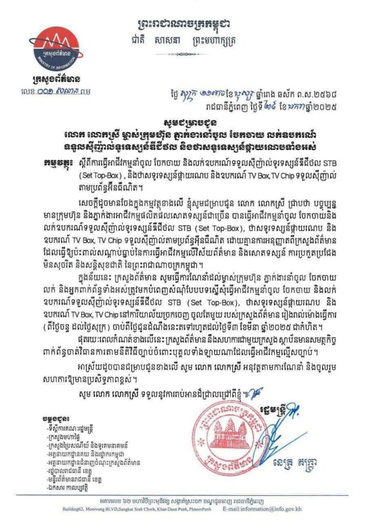 ក្រសួងព័ត៌មានសូមក្រេីនរំលឹកដល់ លោក លោកស្រី ម្ចាស់ក្រុមហ៊ុន ភ្នាក់ងារនាំចូល ចែកចាយ លក់ឧបករណ៍ទទួលសុីញ៉ាល់ទូរទស្សន៍ឌីជីថល និងថាសទូរទស្សន៍ផ្កាយរណបទាំងអស់ ដែលមិនបានសុំអនុញ្ញាតពីក្រសួងព័ត៌មាន ឲ្យមកបំពេញបែបបទស្នើសុំធ្វើអាជីវកម្ម