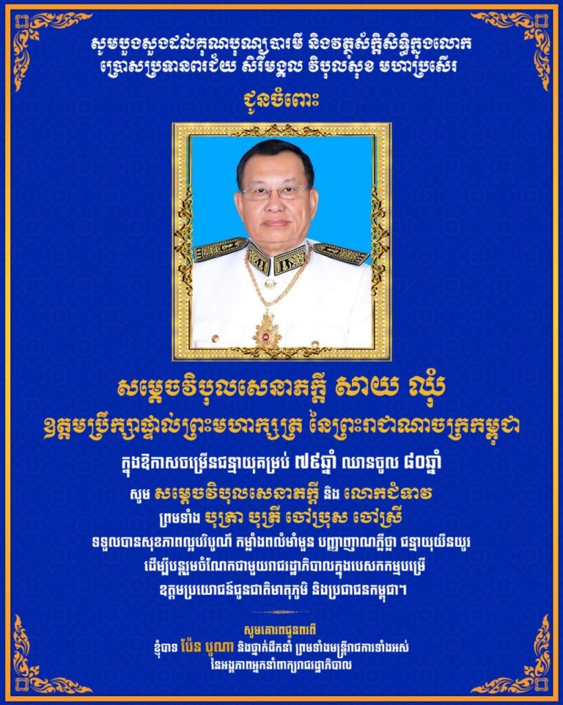 ឯកឧត្តម ប៉ែន បូណា រដ្ឋមន្ត្រីប្រតិភូអមនាយករដ្ឋមន្ត្រី និងជាប្រធានអង្គភាពអ្នកនាំពាក្យរាជរដ្ឋាភិបាល ផ្ញើសារលិខិតជូនពរ សម្តេចវិបុលសេនាភក្តី សាយ ឈុំ ឧត្តមប្រឹក្សាផ្ទាល់ព្រះមហាក្សត្រ នៃព្រះរាជាណាចក្រកម្ពុជាក្នុងឱកាសពិធីចម្រើនអាយុវឌ្ឍនមង្គលគម្រប់ ៧៩ឆ្នាំ ឈានចូល ៨០ឆ្នាំ