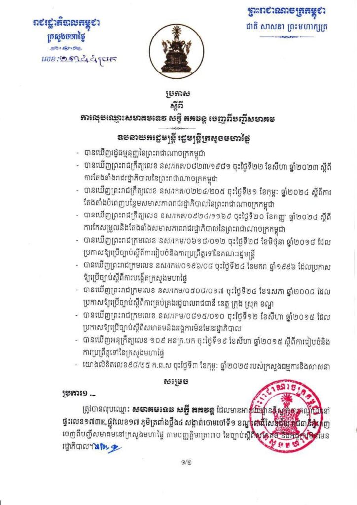 ក្រសួងមហាផ្ទៃសម្រេចលុបឈ្មោះសមាគមទេវ សក្ខី ភគវន្ត ចេញពីបញ្ជីសមាគមនៅក្រសួងមហាផ្ទៃ