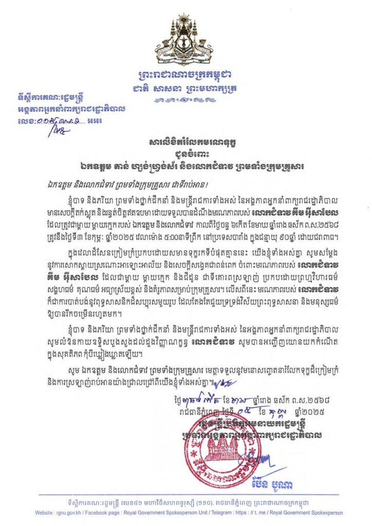 ឯកឧត្តម ប៉ែន បូណា ផ្ញើសារលិខិតចូលរួមរំលែកមរណទុក្ខឯកឧត្តម តាន់ ហ្សង់ហ្រ្វង់ស័រ និង លោកជំទាវ ព្រមទាំងក្រុមគ្រួសារ ចំពោះមរណភាពរបស់លោកជំទាវ គីម អ៊ីសាបែល ដែលត្រូវជាម្តាយ ម្តាយក្មេក របស់ ឯកឧត្តម តាន់ ហ្សង់ហ្រ្វង់ស័រ និងលោកជំទាវ កាលពីថ្ងៃចន្ទ ៦កើត ខែមាឃ ឆ្នាំរោង ឆស័ក ព.ស.២៥៦៨ ត្រូវនឹងថ្ងៃទី៣ ខែកុម្ភៈ ឆ្នាំ២០២៥ នៅប្រទេសបារាំង ក្នុងជន្មាយុ ៩០ឆ្នាំ ដោយជរាពាធ។