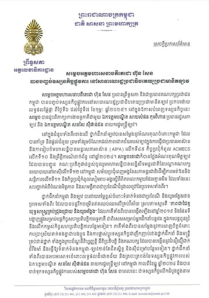 សេចក្តីប្រកាសព័ត៌មាន៖ ស្តីពីលទ្ធផលនៃដំណើរទស្សនកិច្ចផ្លូវការរបស់សម្តេចអគ្គមហាសេនាបតីតេជោ ហ៊ុន សែន ប្រធានព្រឹទ្ធសភា និងជាប្រធានគណបក្សប្រជាជនកម្ពុជា ទៅកាន់សាធារណរដ្ឋប្រជាធិបតេយ្យប្រជាមានិតឡាវ ពីថ្ងៃទី៦ ដល់ថ្ងៃទី៧ ខែកុម្ភៈ ឆ្នាំ២០២៥។