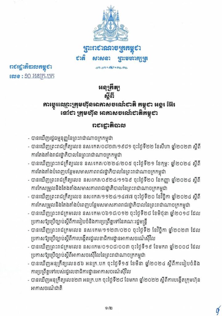 សម្ដេចបវរធិបតី ហ៊ុន ម៉ាណែត ចេញអនុក្រឹត្យប្ដូរឈ្មោះក្រុមហ៊ុនអាកាសចរណ៍ជាតិ កម្ពុជា អង្គរ អ៊ែរ ទៅជាក្រុមហ៊ុន អាកាសចរណ៍ជាតិកម្ពុជា