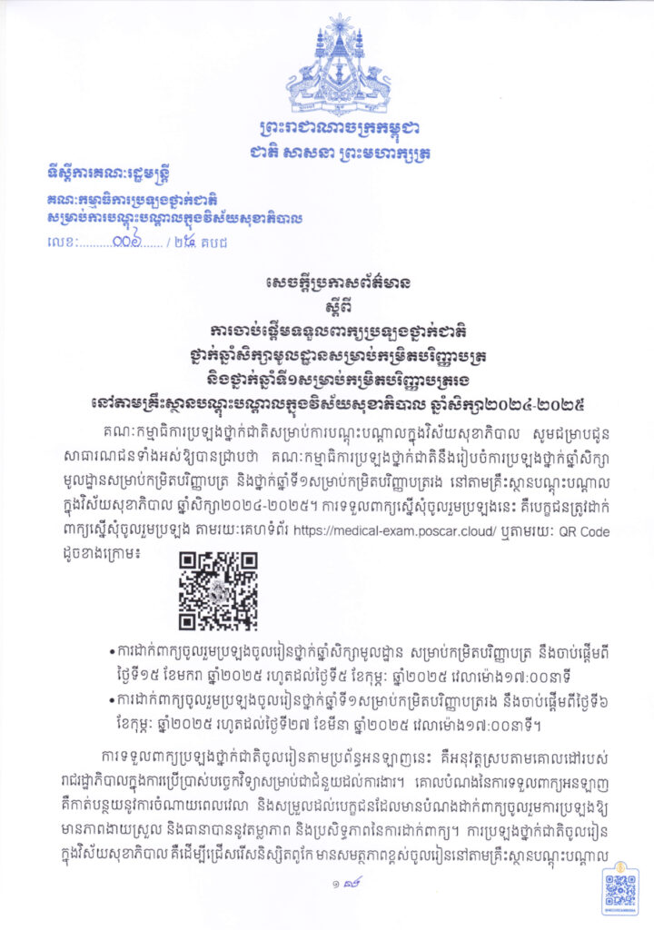 សេចក្តីជូនដំណឹងរបស់គណៈកម្មការប្រឡងថ្នាក់ជាតិសម្រាប់ការបណ្តុះបណ្តាលក្នុងវិស័យសុខាភិបាល
