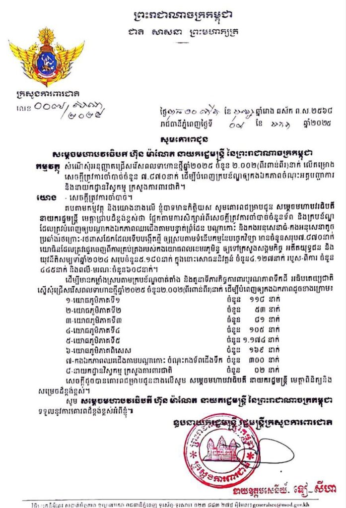 ក្រសួងការពារជាតិ ជ្រើសរើសពលទាហានថ្មី ចំនួន ២០០២នាក់