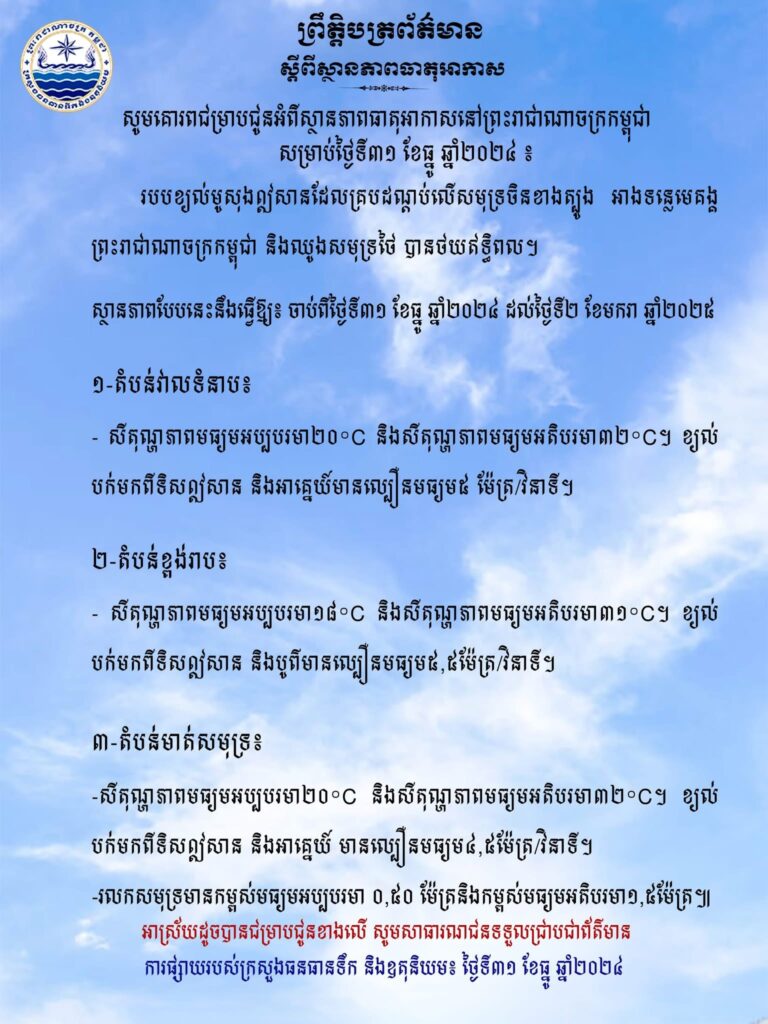 សូមគោរពជម្រាបជូនអំពីស្ថានភាពធាតុអាកាសនៅព្រះរាជាណាចក្រកម្ពុជាសម្រាប់ថ្ងៃទី៣១ ខែធ្នូ ឆ្នាំ២០២៤