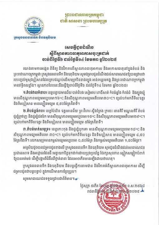 សេចក្តីជូនដំណឹង ស្តីពីស្ថានភាពធាតុអាកាសចុះត្រជាក់ ចាប់ពីថ្ងៃទី៦ ដល់ថ្ងៃទី១៤ ខែមករា ឆ្នាំ២០២៥