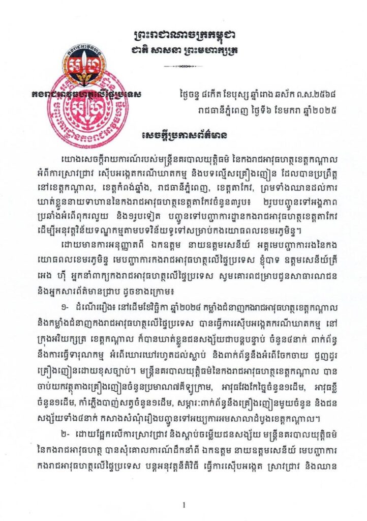 ថ្ងៃទី៦ ខែមករា ឆ្នាំ២០២៥ កងរាជអាវុធហត្ថ បានចេញសេចក្តីប្រកាសព័ត៌មានក្រោយពីមន្ត្រីនគរបាលយុត្តិធម៌ បានបញ្ចប់ការស៊ើបអង្កេត