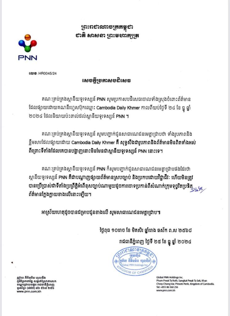 គណៈគ្រប់គ្រងស្ថានីយទូរទស្សន៍ PNN ចេញសេចក្តីប្រកាសព័ត៌មាន សូមប្រកាសបដិសេធចោលទាំងស្រុងចំពោះព័ត៌មានដែលផ្សាយដោយគណនីហ្វេសប៊ុកឈ្មោះ Camcodia Daily Khmer កាលពីយប់ថ្ងៃទី២៤ ខែធ្នូ ឆ្នាំ២០២៤ ដែលផ្សាយព័ត៌មាន និងរូបភាពមិនពិតអំពីស្ថានីយទូរទស្សន៍ PNN