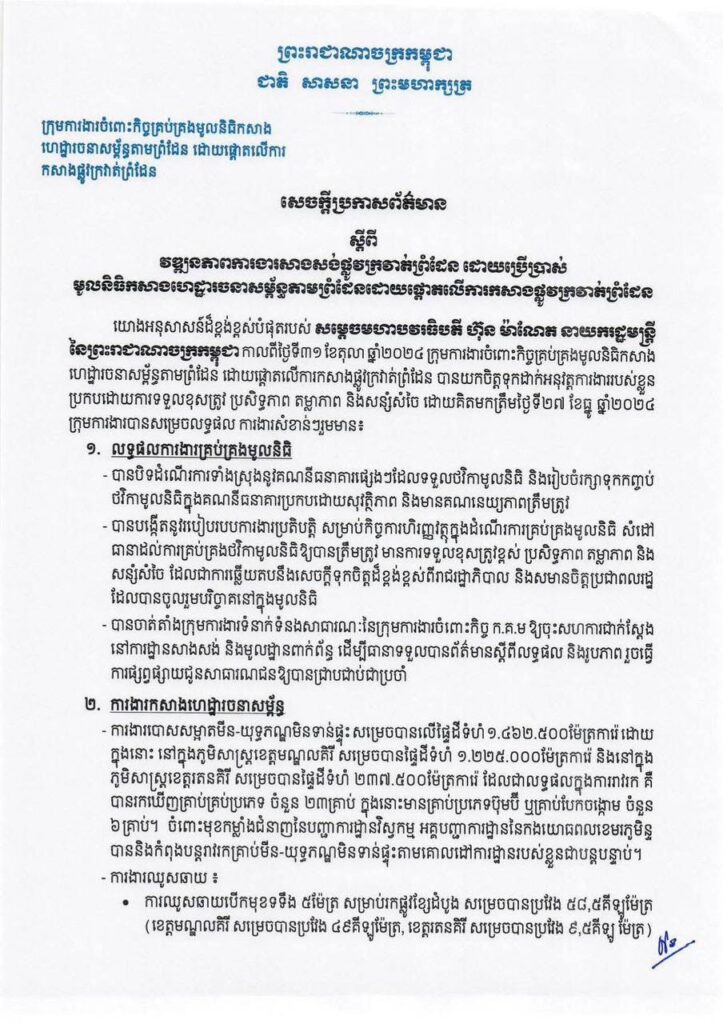 សេចក្តីប្រកាសព័ត៌មាន ស្តីពី វឌ្ឍនភាពការងារសាងសង់ផ្លូវក្រវាត់ព្រំដែន ដោយប្រើប្រាស់ មូលនិធិកសាងហេដ្ឋារចនាសម្ព័ន្ធតាមព្រំដែនដោយផ្តោតលើការកសាងផ្លូវក្រវាត់ព្រំដែន