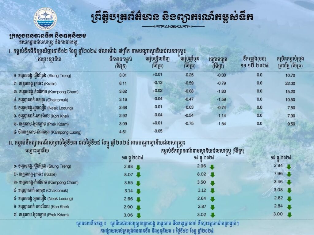 ព្រឹត្តិបត្រព័ត៌មានកម្ពស់ទឹក ម៉ោង ៧ព្រឹក ថ្ងៃទី១២ ខែធ្នូ ឆ្នាំ២០២៤ នៅតាមបណ្ដាស្ថានីយជលសាស្ត្រ
