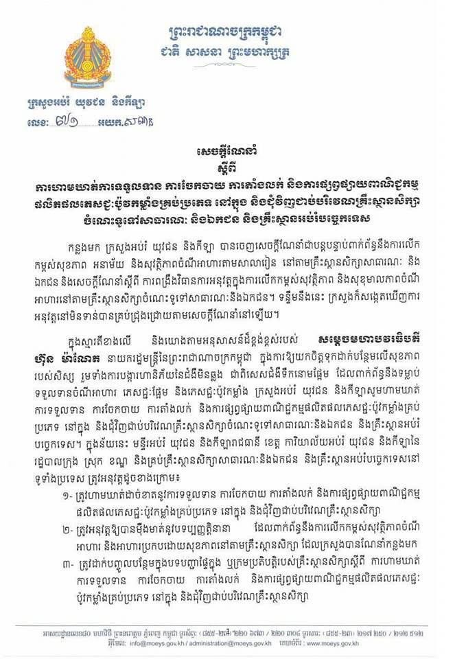 ក្រសួងអប់រំ ចេញសេចក្ដីណែនាំ ស្ដីពីការហាមឃាត់ការទទួលទាន ការចែកចាយ ការតាំងលក់ និងការផ្សព្វផ្សាយពាណិជ្ជកម្ម ផលិតផលភេសជ្ជៈប៉ូវកម្លាំងគ្រប់ប្រភេទ នៅក្នុង និងជុំវិញជាប់បរិវេណគ្រឹះស្ថានសិក្សា ចំណេះទូទៅសាធារណៈ ឯកជន និងគ្រឹះស្ថានអប់រំបច្ចេកទេស