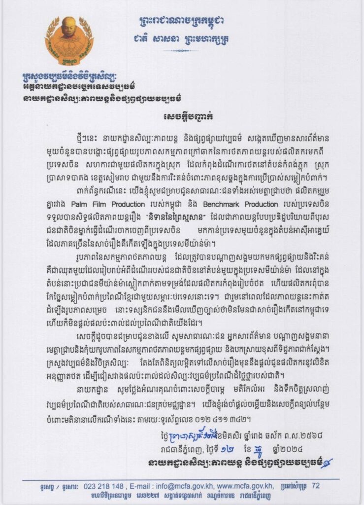 សេចក្តីបញ្ជាក់របស់នាយកដ្ឋានសិល្ប:ភាពយន្ត និងផ្សព្វផ្សាយវប្បធម៌ នៃក្រសួងវប្បធម៌ និងវិចិត្រសិល្បៈស្តីពីការបង្ហោះរូបភាពនៃសកម្មភាពថតភាពយន្ត ដែលត្រូវបានបណ្តាញសង្គមយកមកផ្សព្វផ្សាយនិងផ្ទុះប្រតិកម្មរិះគន់