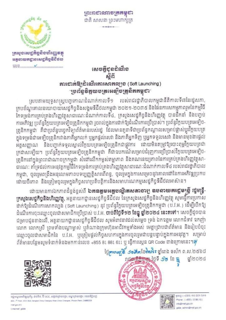 សេចក្តីប្រកាសព័ត៌មានស្តីពីការដាក់ឱ្យដំណេីរការសាកល្បងនូវប្រព័ន្ធវិក្កយបត្រអេឡិចត្រូនិកកម្ពុជា