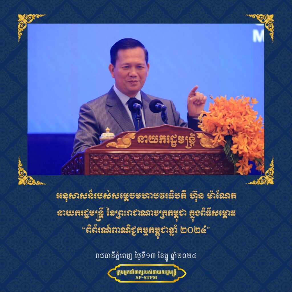 អនុសាសន៍ សម្តេចមហាបវរធិបតី ហ៊ុន ម៉ាណែត នាយករដ្ឋមន្ត្រី នៃព្រះរាជាណាចក្រកម្ពុជា ក្នុង «ពិធីសម្ពោធពិព័រណ៍ពាណិជ្ជកម្មកម្ពុជា ឆ្នាំ២០២៤» រាជធានីភ្នំពេញ ថ្ងៃទី១៣ ខែធ្នូ ឆ្នាំ២០២៤