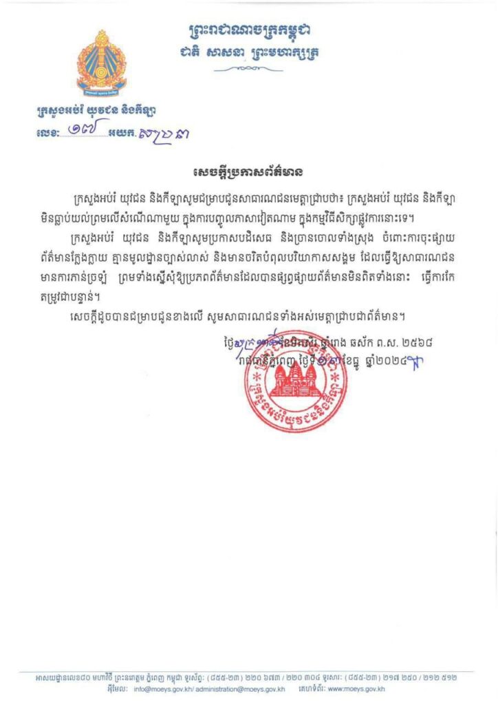 ក្រសួងអប់រំ យុវជននិងកីឡា បដិសេធនិងច្រានចោលទាំងស្រុងចំពោះការផ្សាយព័ត៌មានក្លែងក្លាយដែលថាក្រសួងបញ្ចូលភាសាវៀតណាមចូលក្នុងកម្មវិធីសិក្សាផ្លូវការ