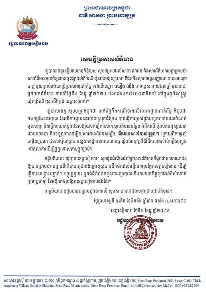 រដ្ឋបាលខេត្តសៀមរាប ចេញសេចក្តីប្រកាសព័ត៌មាន អំពីករណីប៉ុនប៉ងមនុស្សឃាតពីជនមិនស្គាល់អត្តសញ្ញាណ
