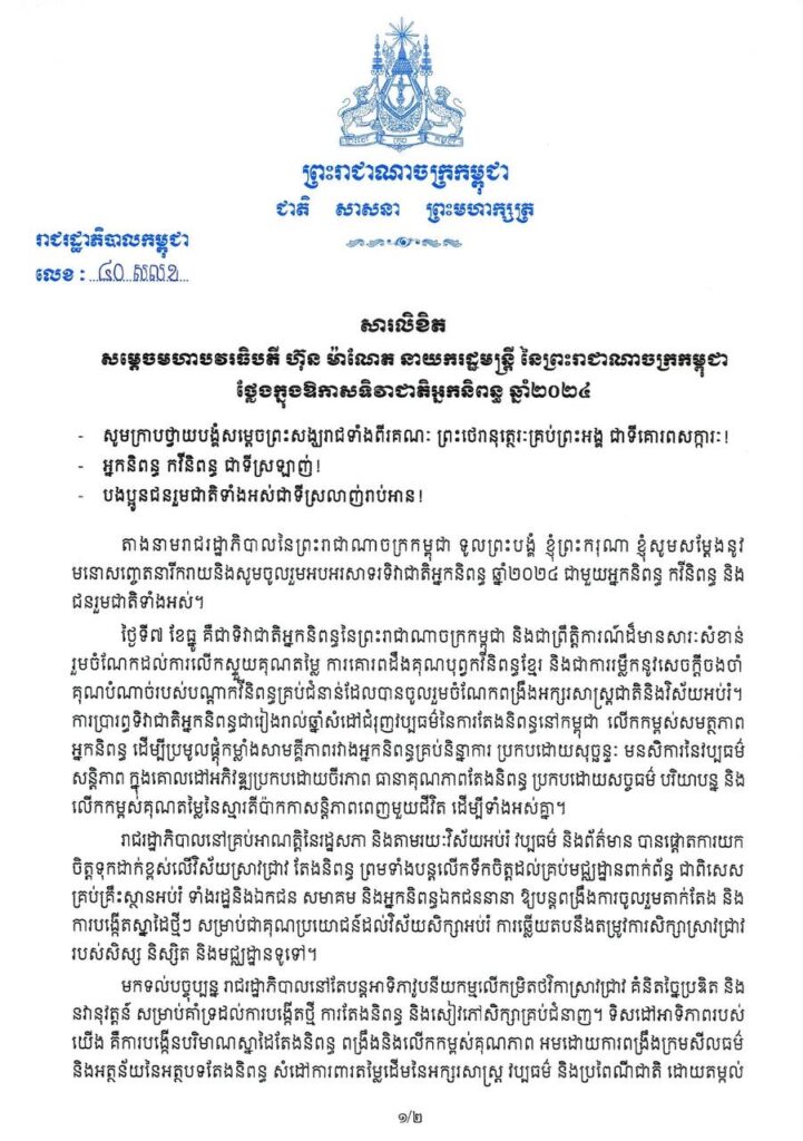 សារលិខិតរបស់ សម្ដេចមហាបវរធិបតី ហ៊ុន ម៉ាណែត នាយករដ្ឋមន្ត្រី នៃព្រះរាជាណាចក្រកម្ពុជា ក្នុងឱកាសទិវាជាតិអ្នកនិពន្ធ ឆ្នាំ២០២៤