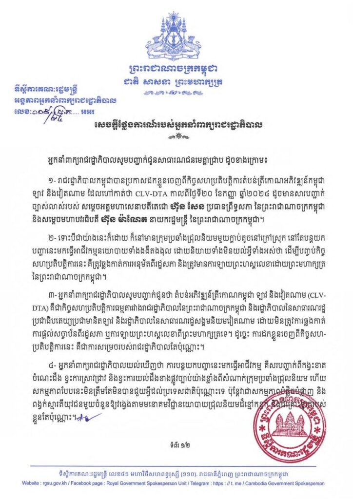 អ្នកនាំពាក្យរាជរដ្ឋាភិបាលសេចក្តីថ្លែងការណ៍៦ចំណុច បញ្ជាក់សារជាថ្មី ស្តីពី «ការដកខ្លួនចេញពីកិច្ចសហប្រតិបត្តិការតំបន់ត្រីកោណអភិវឌ្ឍន៍កម្ពុជា ឡាវ និងវៀតណាម ដែលហៅកាត់ថា CLV-DTA