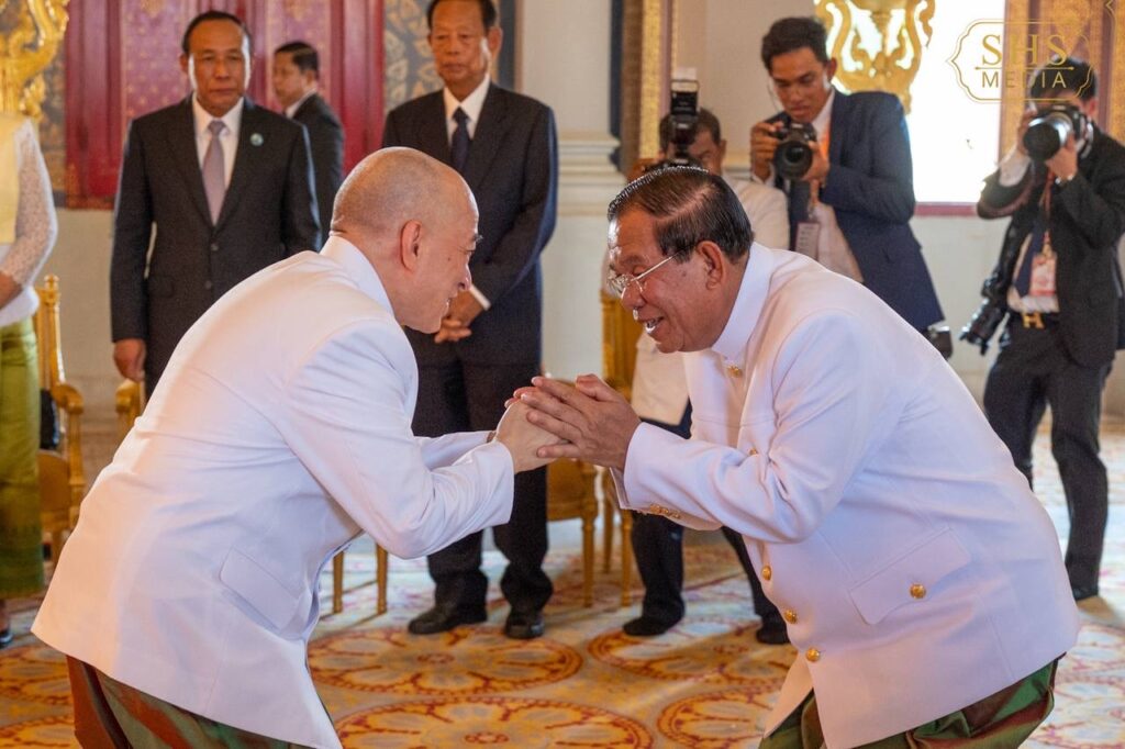 សម្តេចអគ្គមហាសេនាបតីតេជោ ហ៊ុន សែន ប្រធានព្រឹទ្ធសភានៃព្រះរាជាណាចក្រកម្ពុជា ប្រធានក្រុមឧត្តមប្រឹក្សាផ្ទាល់ព្រះមហាក្សត្រ និងជាប្រធានគណបក្សប្រជាជនកម្ពុជា គោរពថ្វាយព្រះពរ ព្រះករុណា ព្រះបាទ សម្តេចព្រះបរមនាថ នរោត្តម សីហមុនី ព្រះមហាក្សត្រនៃព្រះរាជាណាចក្រកម្ពុជា ក្នុងឱកាសដ៏មហានក្ខត្តឫក្សខួបលើកទី ២០ នៃការគ្រងរាជសម្បត្តិជាព្រះមហាក្សត្រនៃព្រះរាជាណាចក្រកម្ពុជា៕