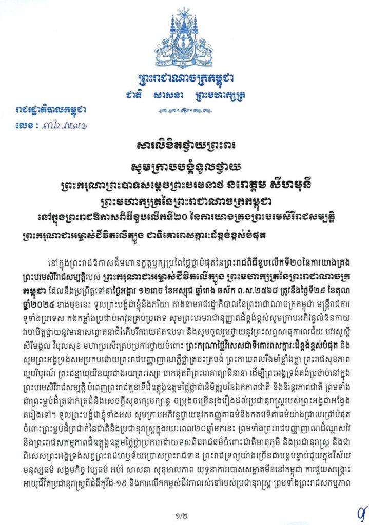 សារលិខិតថ្វាយព្រះពររបស់រាជរដ្ឋាភិបាលកម្ពុជា គោរពក្រាបបង្គំទូលថ្វាយ ព្រះករុណាព្រះបាទសម្តេចព្រះបរមនាថ នរោត្តម សីហមុនី ព្រះមហាក្សត្រនៃព្រះរាជាណាចក្រកម្ពុជា នៅក្នុងព្រះរាជឱកាសពិធីខួបលើកទី២០ នៃការយាងគ្រងព្រះបរមសិរីរាជសម្បត្តិ