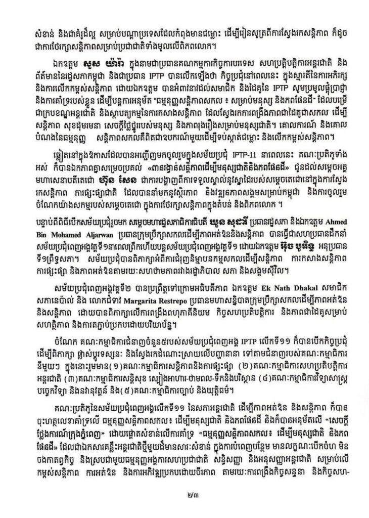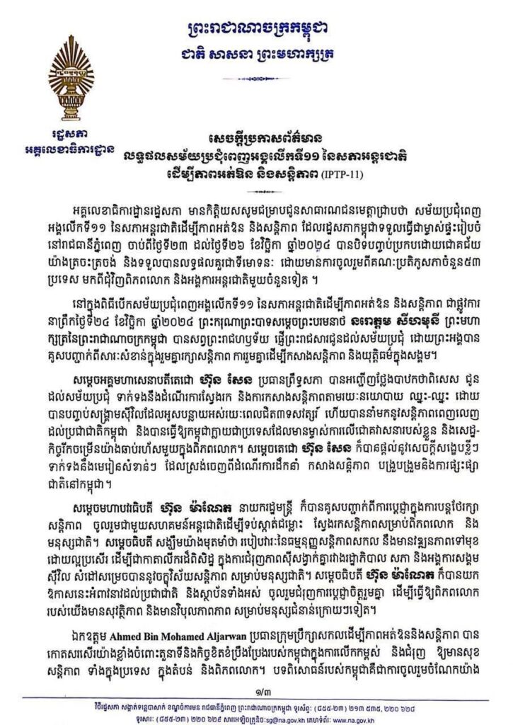 សេចក្តីប្រកាសព័ត៌មាន ស្តីពីលទ្ធផលសម័យប្រជុំពេញអង្គលើកទី១១ នៃសភាអន្តរជាតិ ដើម្បីភាពអត់ឱន និងសន្តិភាព (IPTP-11)
