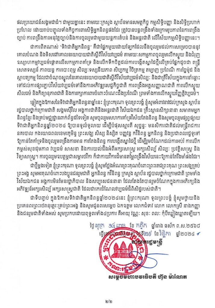 សារលិខិតរបស់ សម្ដេចមហាបវរធិបតី ហ៊ុន ម៉ាណែត នាយករដ្ឋមន្ត្រី នៃព្រះរាជាណាចក្រកម្ពុជា ក្នុងឱកាសទិវាជាតិអ្នកនិពន្ធ ឆ្នាំ២០២៤
