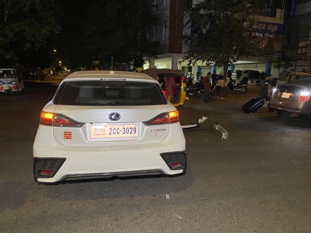 ស្ត្រីម្នាក់បេីករថយន្ត ឡិចស៊ីស CT200h ពាក់ផ្លាកលេខភ្នំពេញ 2CC-3029 តាមបណ្ដោយផ្លូវ228 ក្នុងទិសដៅពីលិចទៅកេីត បុ.ករថយន្ត ព្រុស