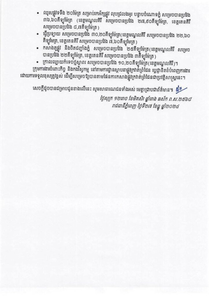 សេចក្តីប្រកាសព័ត៌មាន ស្តីពី វឌ្ឍនភាពការងារសាងសង់ផ្លូវក្រវាត់ព្រំដែន ដោយប្រើប្រាស់ មូលនិធិកសាងហេដ្ឋារចនាសម្ព័ន្ធតាមព្រំដែនដោយផ្តោតលើការកសាងផ្លូវក្រវាត់ព្រំដែន