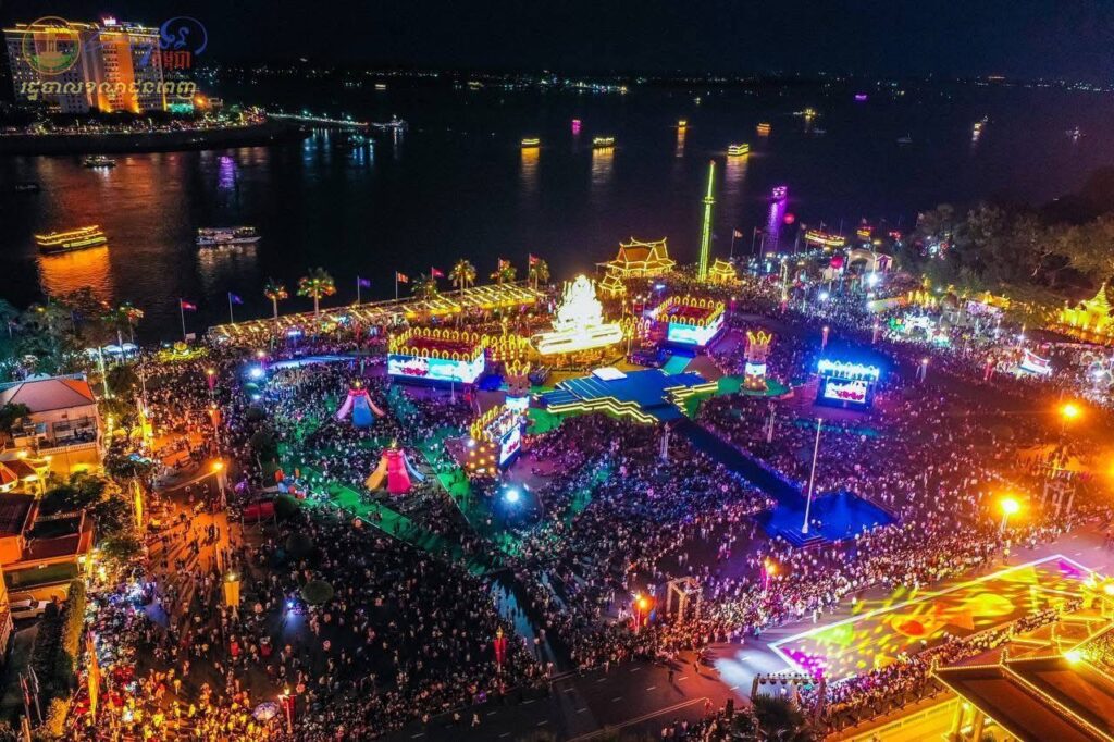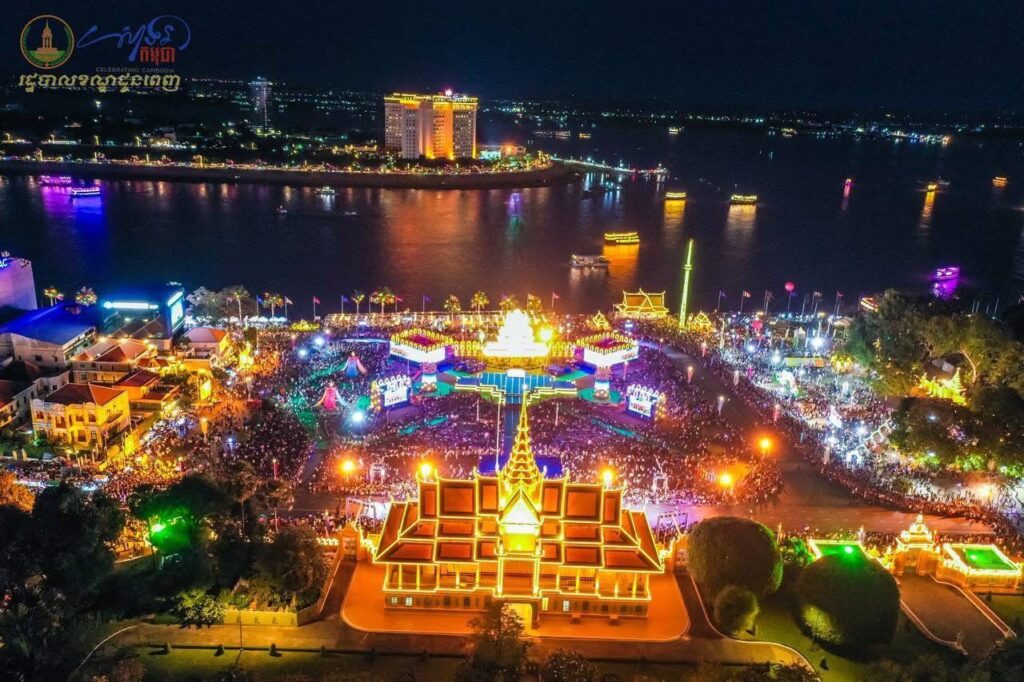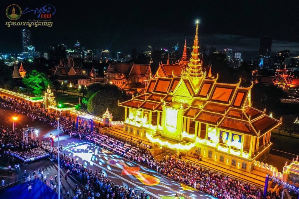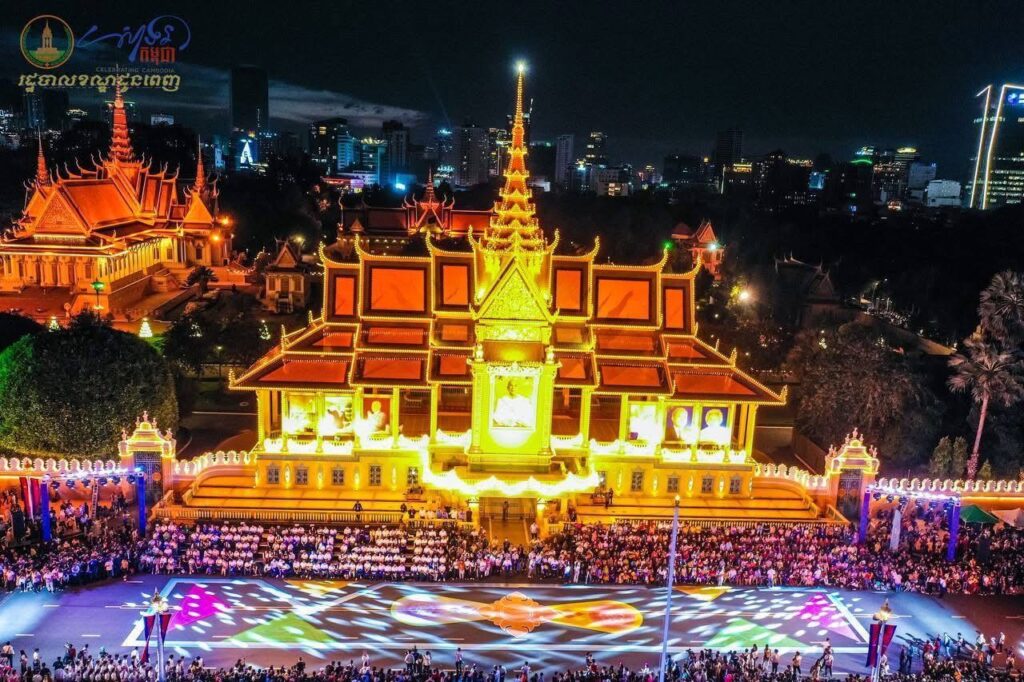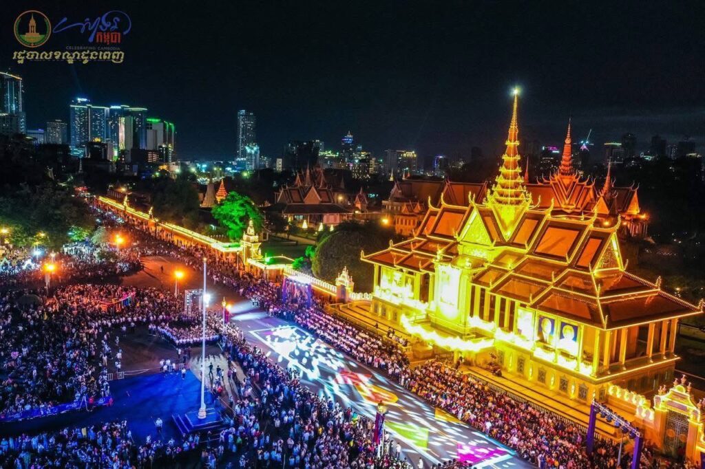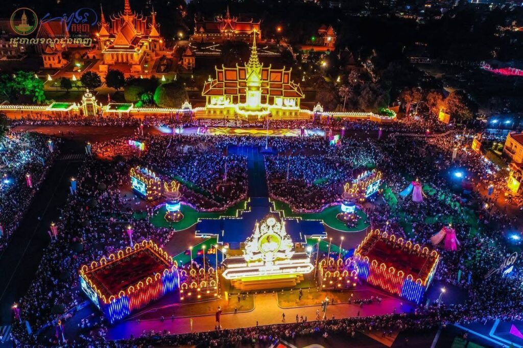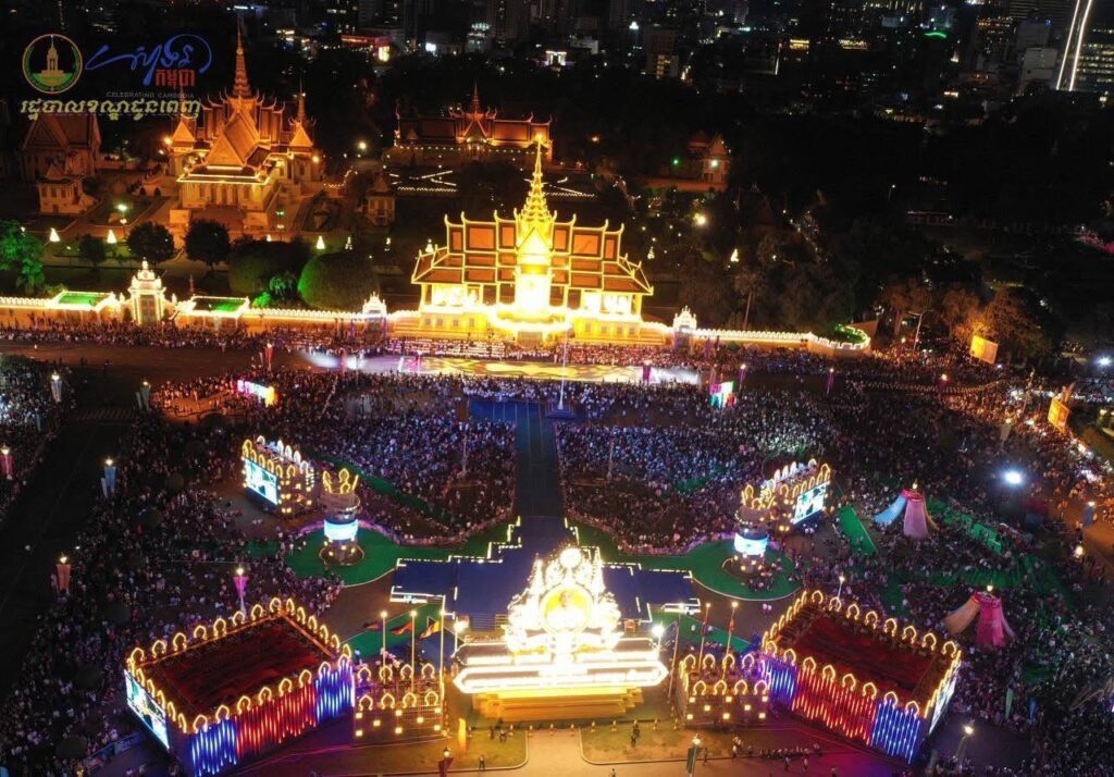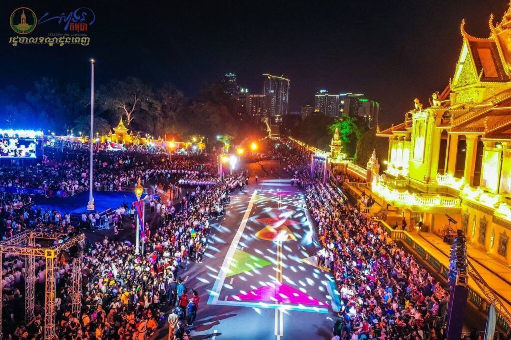 ទិដ្ឋភាពពីខាងលើនាពេលរាត្រី នៃព្រឹត្តិការណ៍ “សាទរកម្ពុជា” នៅថ្ងៃទី៣១ ខែធ្នូ ឆ្នាំ២០២៤ (ឆ្លងចូលឆ្នាំសកល ២០២៥) នៅមុខព្រះបរមរាជវាំង ស្ថិតក្នុងសង្កាត់ជ័យជំនះ ខណ្ឌដូនពេញ រាជធានីភ្នំពេញ