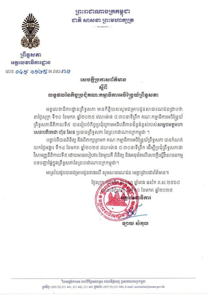 សេចក្តីប្រកាសព័ត៌មាន ស្តីពីលទ្ធផលនៃកិច្ចប្រជុំគណៈកម្មាធិការអចិន្ត្រៃយ៍ព្រឹទ្ធសភា អញ្ជើញដឹកនាំដោយ សម្តេចអគ្គមហាសេនាបតីតេជោ ហ៊ុន សែន ប្រធានព្រឹទ្ធសភានៃព្រះរាជាណាចក្រកម្ពុជា នាព្រឹកថ្ងៃទី១០ ខែមករា ឆ្នាំ២០២៥ នៅវិមានព្រឹទ្ធសភា រាជធានីភ្នំពេញ