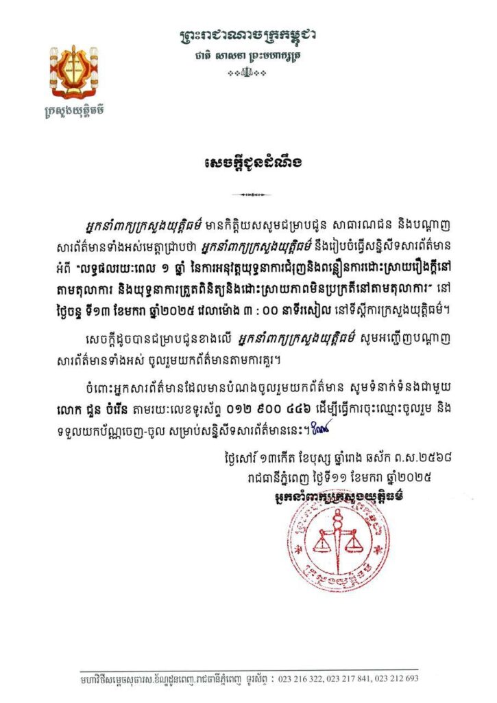 អ្នកនាំពាក្យក្រសួងយុត្តិធម៌ នឹងរៀបចំធ្វើសន្និសីទសារព័ត៌មានអំពី “លទ្ធផលរយៈពេល ១ ឆ្នាំ នៃការអនុវត្តយុទ្ធនាការជំរុញនិងពន្លឿនការដោះស្រាយរឿងក្តីនៅតាមតុលាការ និងយុទ្ធនាការត្រួតពិនិត្យនិងដោះស្រាយភាពមិនប្រក្រតីនៅតាមតុលាការ”