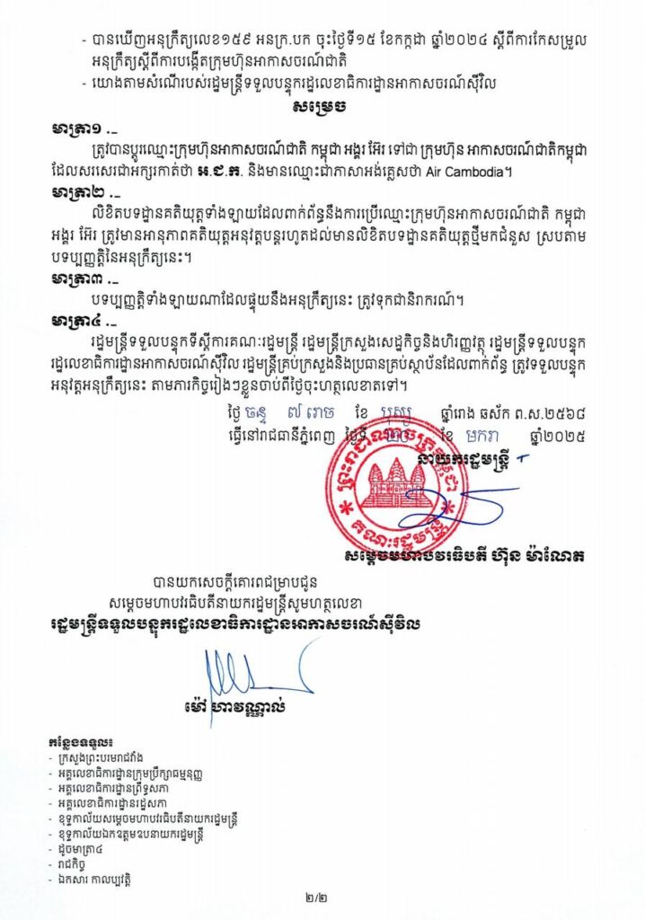 សម្ដេចបវរធិបតី ហ៊ុន ម៉ាណែត ចេញអនុក្រឹត្យប្ដូរឈ្មោះក្រុមហ៊ុនអាកាសចរណ៍ជាតិ កម្ពុជា អង្គរ អ៊ែរ ទៅជាក្រុមហ៊ុន អាកាសចរណ៍ជាតិកម្ពុជា
