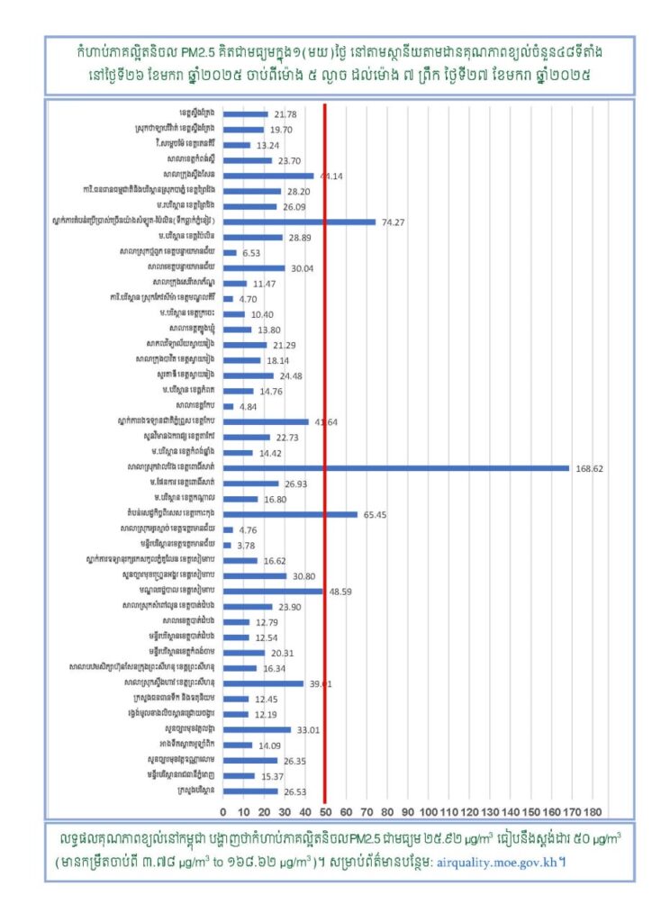ក្រសួងបរិស្ថានសូមជូនដំណឹងអំពីស្ថានភាពគុណភាពខ្យល់នៅក្នុងព្រះរាជាណាចក្រកម្ពុជាសម្រាប់ថ្ងៃទី២៦ ខែមករា ឆ្នាំ២០២៥ ចាប់ពីម៉ោង ៥ ល្ងាច ដល់ម៉ោង ៧ព្រឹក ថ្ងៃទី២៧ ខែមករា ឆ្នាំ២០២៥