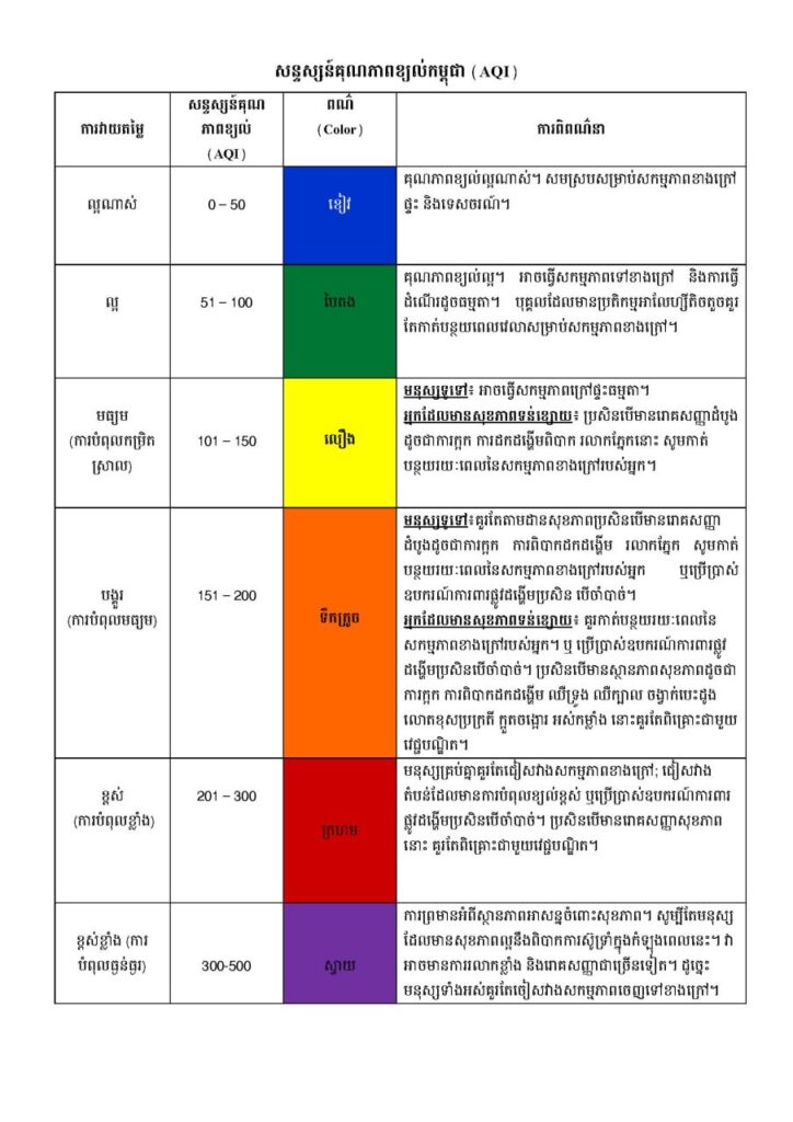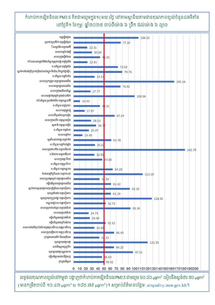 សេចក្ដីជូនដំណឹង៖ ក្រសួងបរិស្ថានសូមជូនដំណឹងអំពីស្ថានភាពគុណភាពខ្យល់នៅក្នុងព្រះរាជាណាចក្រកម្ពុជា សម្រាប់ថ្ងៃទី១ ខែកុម្ភៈ ឆ្នាំ២០២៥ ចាប់ពីម៉ោង ៦ ព្រឹក ដល់ម៉ោង ៦ ល្ងាច