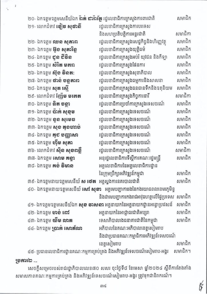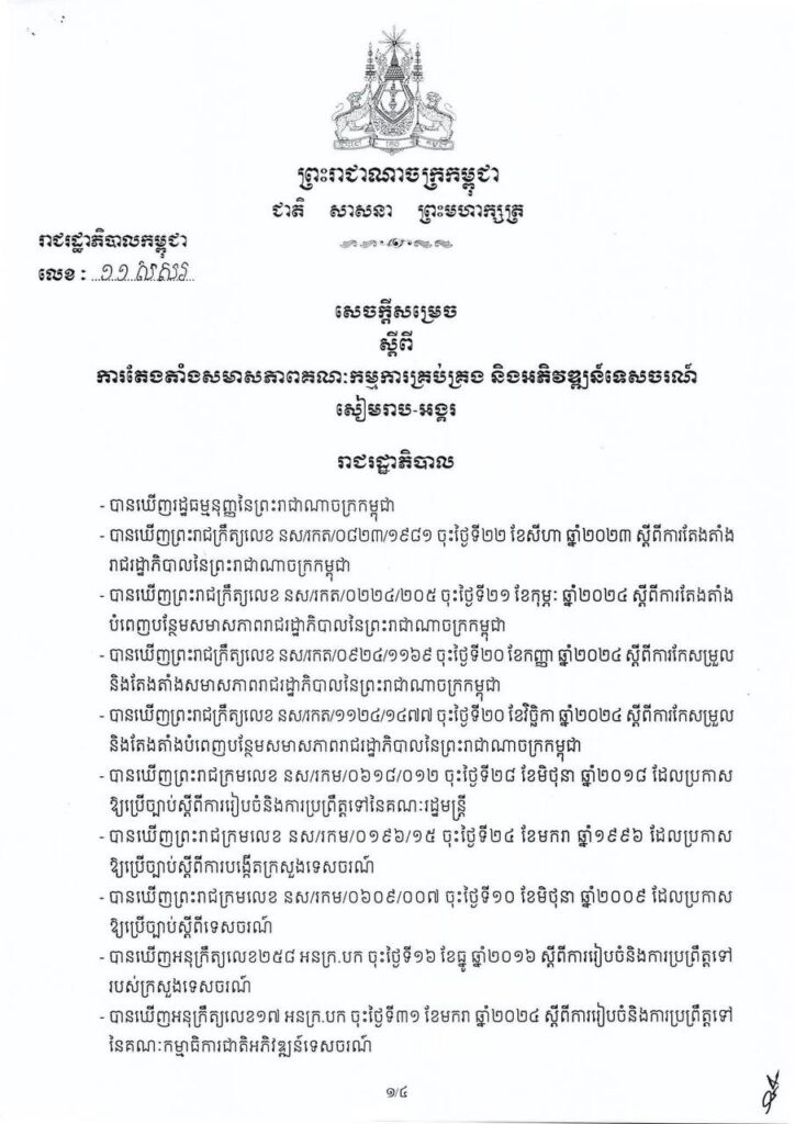 រាជរដ្ឋាភិបាល | ចេញសេចក្តីសម្រេចតែងតាំងសមាសភាព គណៈកម្មការគ្រប់គ្រង និងអភិវឌ្ឍន៍ទេសចរណ៍ សៀមរាប-អង្គរ