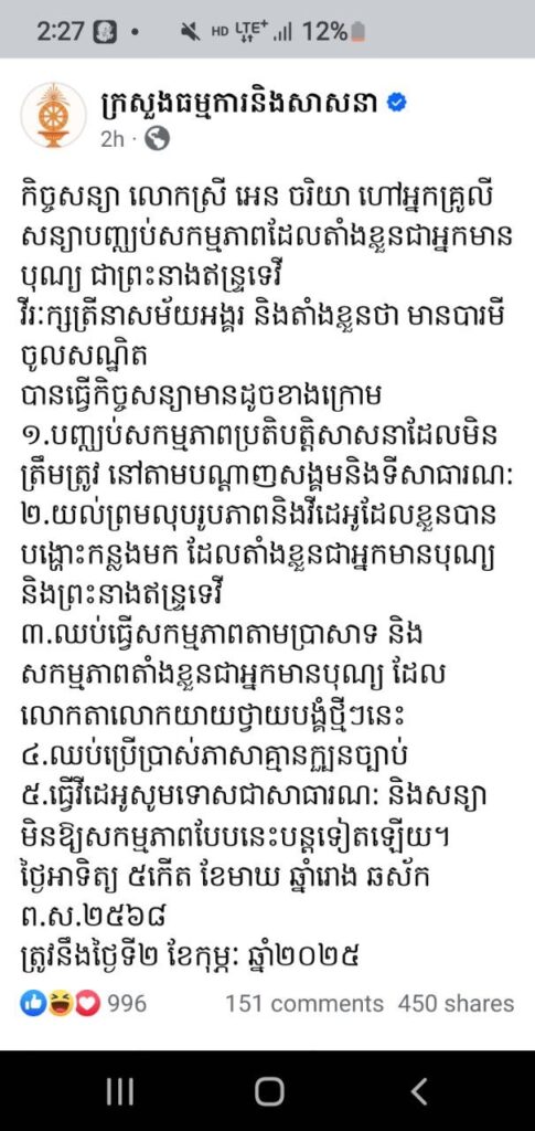 ធ្វេីកិច្ចសន្យា លោកស្រី អេន ចរិយា ហៅអ្នកគ្រូលី សន្យាបញ្ឈប់សកម្មភាពដែលតាំងខ្លួនជាអ្នកមានបុណ្យ ជាព្រះនាងឥន្ទ្រទេវី វីរៈក្សត្រីនាសម័យអង្គរ និងតាំងខ្លួនថា មានបារមី ចូលសណ្ឋិត