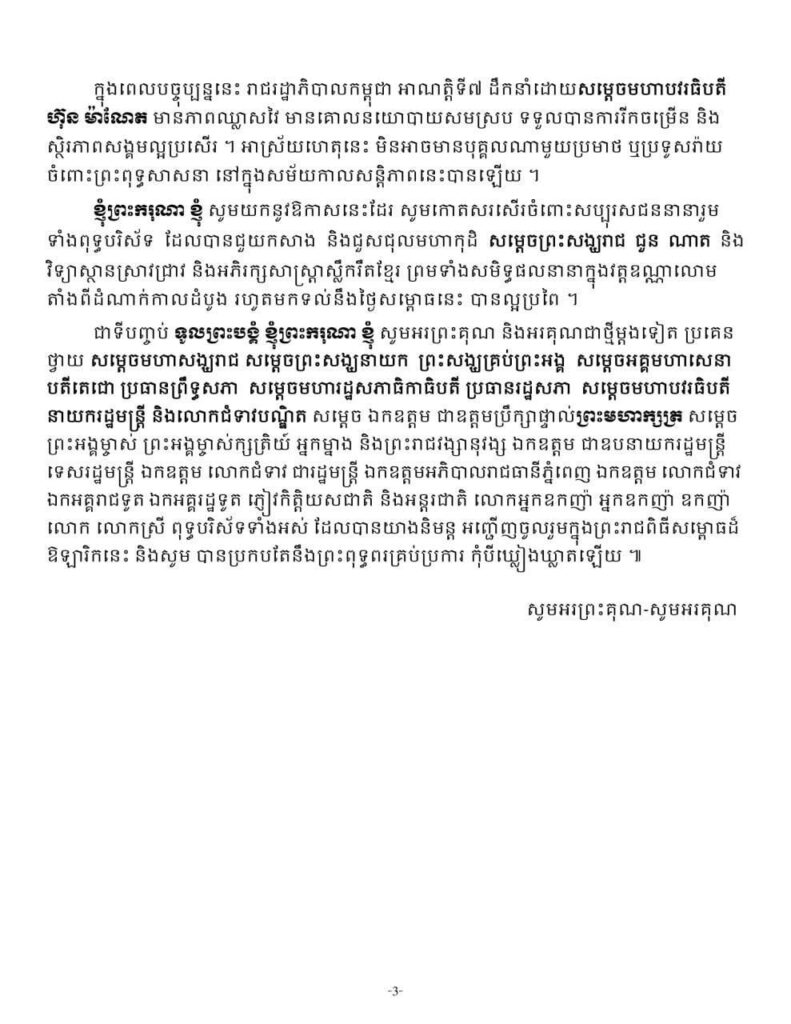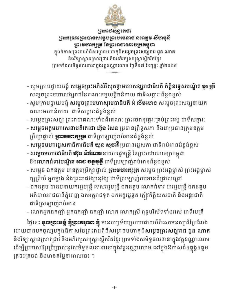 ព្រះរាជសុន្ទរកថារបស់ ព្រះករុណាព្រះមហាក្សត្រនៃព្រះរាជាណាចក្រកម្ពុជា ក្នុងឱកាសស្តេចយាងសម្ពោធ មហាកុដិសម្តេចព្រះសង្ឃរាជ ជួន ណាត, វិទ្យាស្ថានស្រាវជ្រាវ និងអភិរក្សសាស្ត្រាស្លឹករឹតខ្មែរ នៅវត្តឧណ្ណាលោម នាព្រឹកថ្ងៃទី១៧ ខែកុម្ភៈ ឆ្នាំ២០២៥។