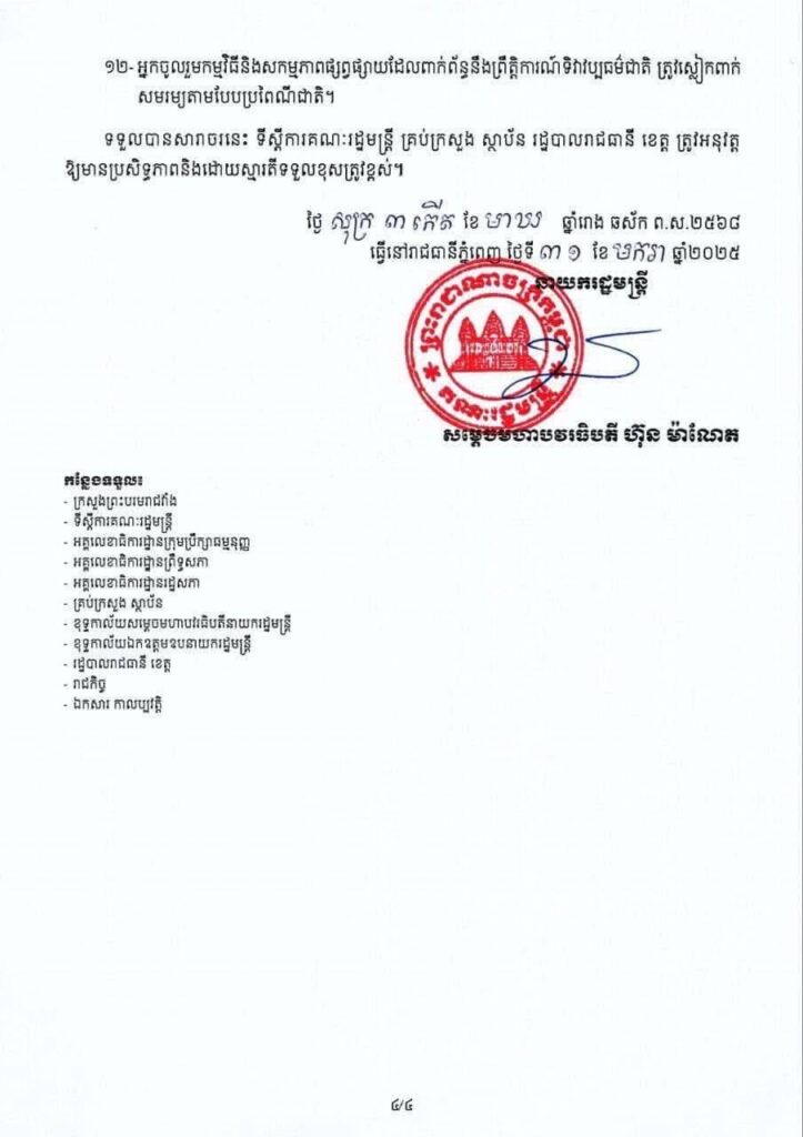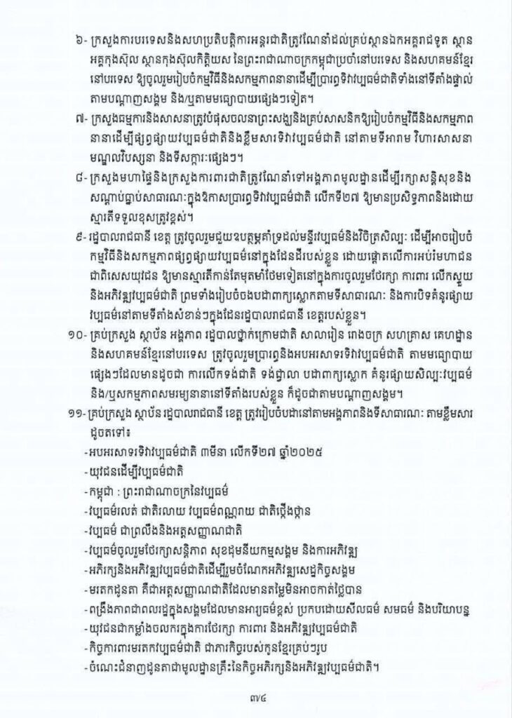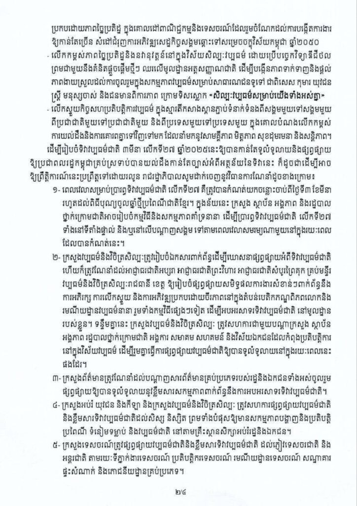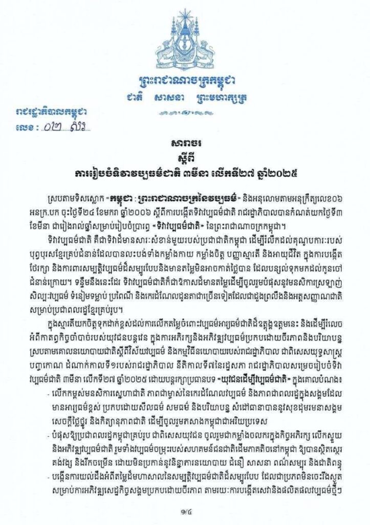 រាជរដ្ឋាភិបាលកម្ពុជា ចេញសារាចរ ស្តីពី ការរៀបចំទិវាវប្បធម៌ជាតិ ៣មីនា លើកទី២៧ ឆ្នាំ២០២៥ ស្របតាមទិសស្លោក «កម្ពុជា : ព្រះរាជាណាចក្រនៃវប្បធម៌» និងអនុលោមតាមអនុក្រឹត្យលេខ០៦ អនក្រ.បក ចុះថ្ងៃទី២៤ ខែមករា ឆ្នាំ២០០៦ ស្តីពីការបង្កើតទិវាវប្បធម៌ជាតិ រាជរដ្ឋាភិបាលបានកំណត់យកថ្ងៃទី៣ ខែមីនា ជារៀងរាល់ឆ្នាំសម្រាប់រៀបចំប្រារព្ធ «ទិវាវប្បធម៌ជាតិ» នៃព្រះរាជាណាចក្រកម្ពុជា។
