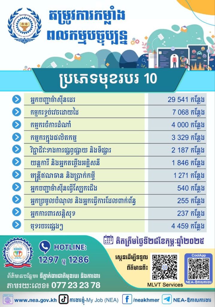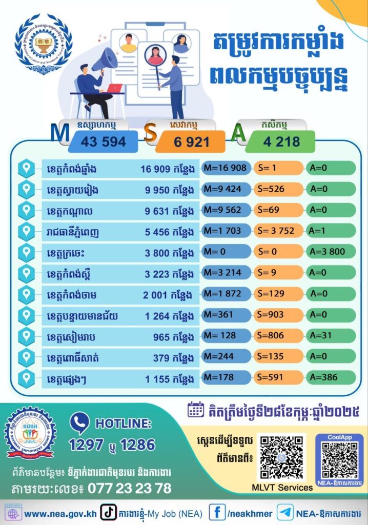 កំពុងស្វែងរកការងារមែនទេ? គិតត្រឹមថ្ងៃទី១ ខែមីនា ឆ្នាំ២០២៥នេះ ទីភ្នាក់ងារជាតិមុខរបរ និងការងារ(NEA) នៃក្រសួងការងារ និងបណ្តុះបណ្តាលវិជ្ជាជីវៈ មានការងាររហូតដល់ទៅចំនួន ៥៤ ៧៣៣ កន្លែង កំពុងរង់ចាំអ្នក!