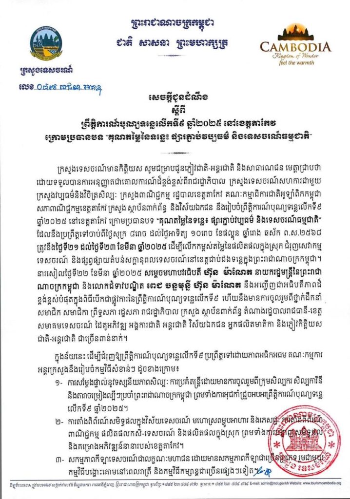សេចក្តីជូនដំណឹង ស្តីពីព្រឹត្តិការណ៍បុណ្យទន្លេលើកទី៩ ឆ្នាំ២០២៥ នៅខេត្តតាកែវ ក្រោមប្រធានបទ«គុណតម្លៃនៃទន្លេ៖ ផ្សារភ្ជាប់វប្បធម៌ និងទេសចរណ៍ធម្មជាតិ»