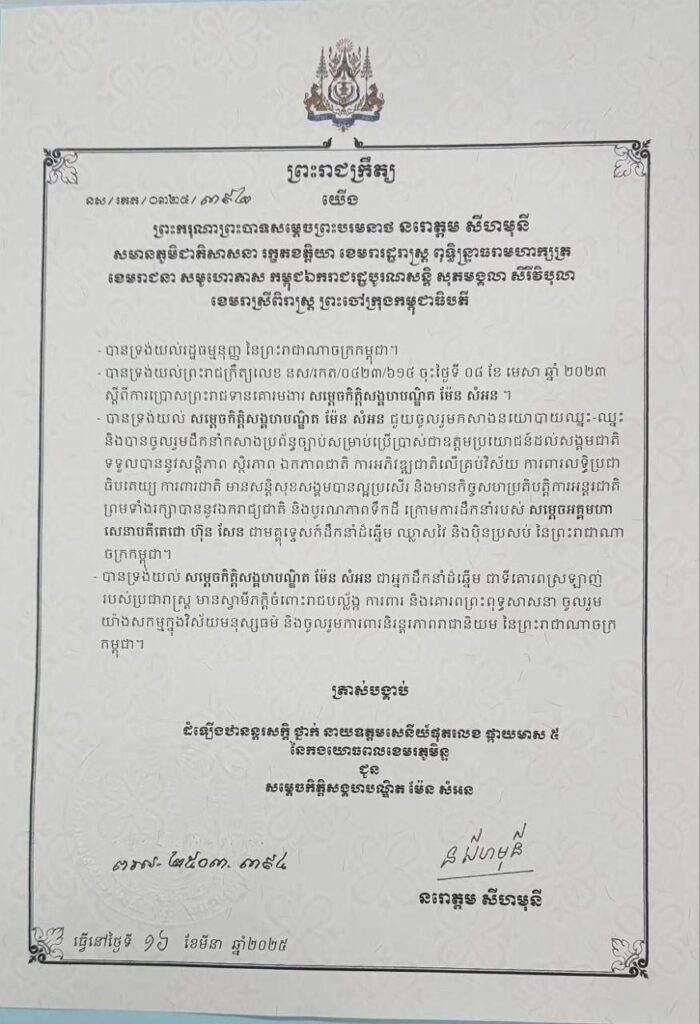 ព្រះករុណា ព្រះបាទ សម្តេចព្រះបរមនាថ នរោត្តម សីហមុនី ព្រះមហាក្សត្រនៃព្រះរាជាណាចក្រកម្ពុជា ត្រាស់បង្គាប់ដំឡើងឋានន្តរសក្តិ ថ្នាក់ នាយឧត្តមសេនីយ៍ផុតលេខផ្កាយមាស ៥ នៃកងយោធពលខេមរភូមិន្ទ ជូន សម្តេចពិជ័យសេនា ទៀ បាញ់ និងសម្តេចកិត្តិសង្គបណ្ឌិត ម៉ែន សំអន