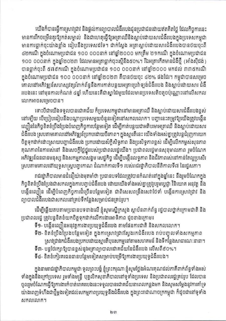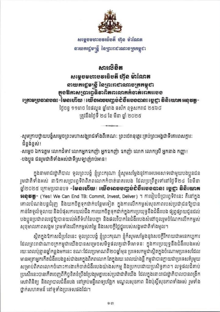 សារលិខិត សម្តេចមហាបវរធិបតី ហ៊ុន ម៉ាណែត នាយករដ្ឋមន្ត្រី នៃព្រះរាជាណាចក្រកម្ពុជា ក្នុងឱកាសប្រារព្ធទិវាពិភពលោកកំចាត់រោគរបេង ក្រោមប្រធានបទ៖ «មែនហើយ ! យើងអាចបញ្ចប់ជំងឺរបេងបាន៖ ប្តេជ្ញា វិនិយោគ អនុវត្ត»